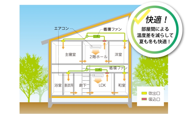 各階に設置したエアコン2台の温風・冷風を各部屋へ