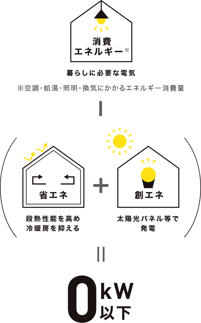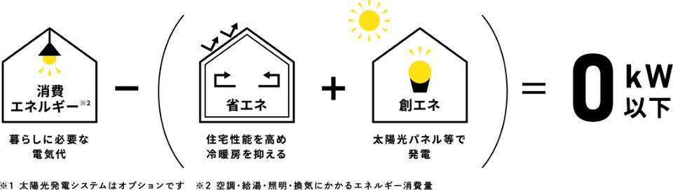 住宅性能や高効率設備機器により住まいの省エネ性を高めて「使うエネルギー」を減らし、使うエネルギーを太陽光発電などで「自家発電」し、家庭で必要なエネルギーを「自給自足」するので光熱費を削減することができます。