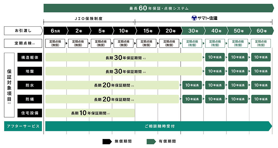 ヤマト住建では、各対象項目(構造躯体・地盤・防水・防蟻)保証満了時に、10年ごとに弊社における点検結果に基づき必要な有償メンテナンスを行った場合、保証を延長させていただくことで、お引渡し日より最長60年間保証いたします。