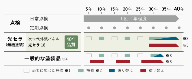 3層のコーティングが長年にわたって色あせ・日焼けを防ぎ新築時の外観を保ちます。塗り替えや張り替えのメンテナンスは40年後。つまり費用も40年先。どこまでも強い外壁は、どこまでも経済的でもあります。