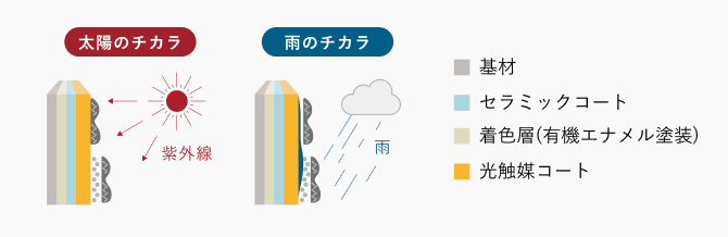 太陽のチカラで外壁に付着した汚れを分解し、雨水で洗い流すダブルの洗浄サイクルでセルフクリーニング。また、光触媒コートにより表面に付着したウイルスや菌を分解します。