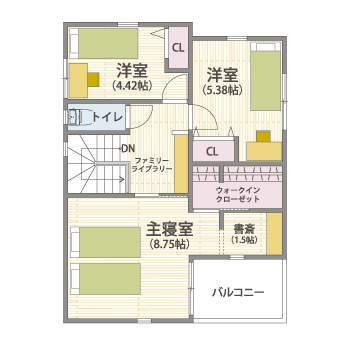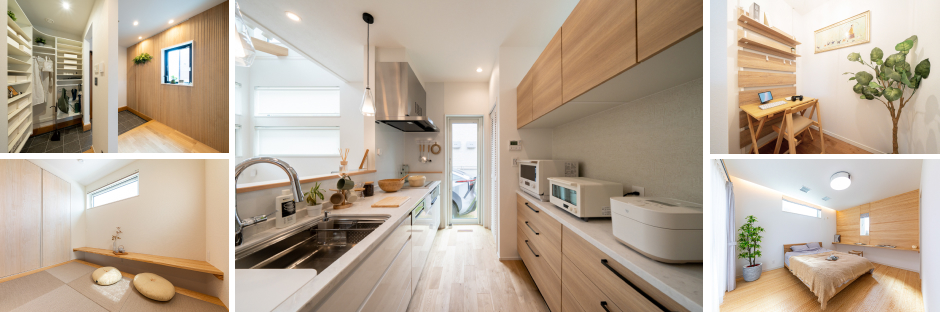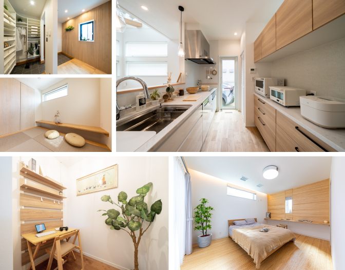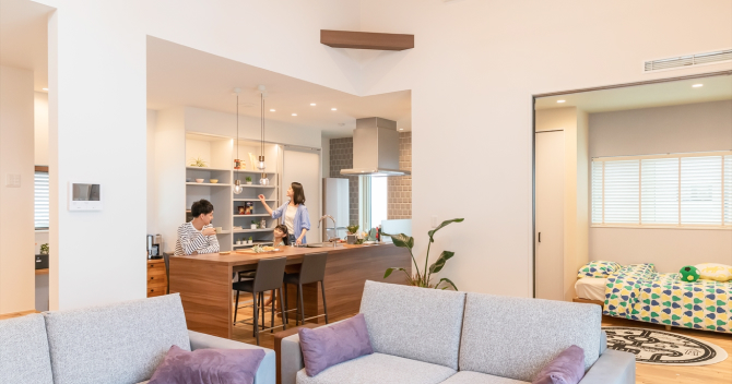 和室と繋がる一体空間のLDKが特徴的な住まいは、高断熱・高気密で木の温かみを感じる家。各部屋に収納スペースやWICLを設けており、家の中が散らばらないよう考えられています。家族が心地よく暮らせるアイデアが満載。
