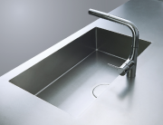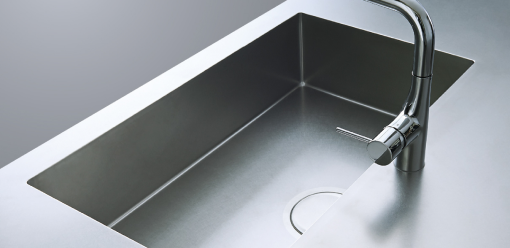 縁を無くしたフランジレス排水口。ステンレス一体成型なのでお掃除楽々