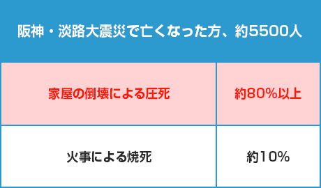 阪神・淡路大震災の地震による直接的な被害で亡くなった人の数、約5500人のうち、家屋の倒壊による圧死が80%以上でした。