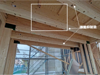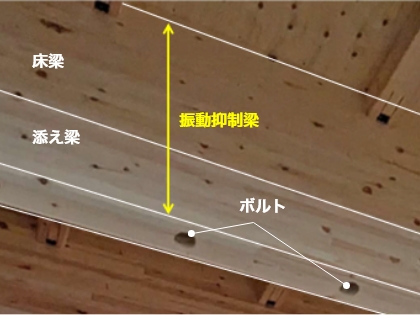 ヤマト住建では、通常の床梁の下に高さ24cmの「添え梁」を取り付けることにより、床の振動を抑制しています。