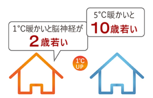 MRI画像の反応分析によると、室温の低い住宅では脳神経の働きが不活発になる傾向があります。室温の低い住宅より1℃高いと脳神経が2歳若くなるとされています。