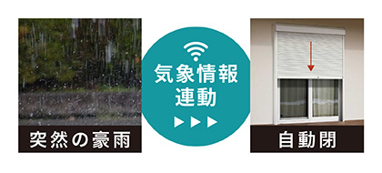 ゲリラ豪雨などの際、IoT住宅では気象情報との連動で電動シャッターが自動で閉じるので、大切な家をしっかり守ります。