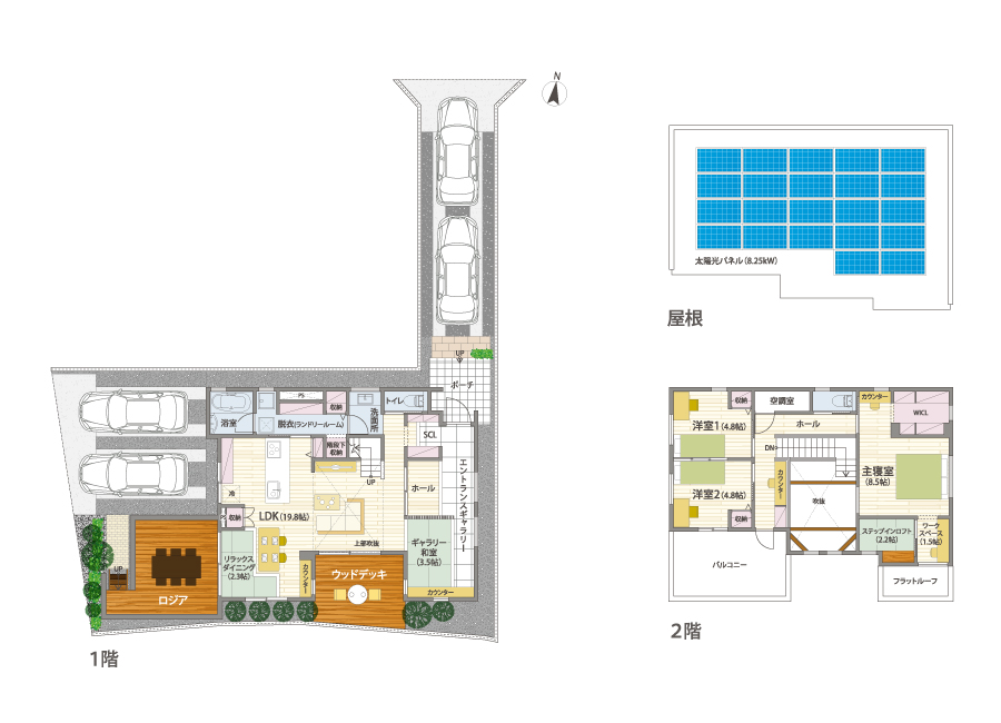 アウトドアリビングを楽しめるデッキやロジア、使い道が広がる大きなエントランス、空間を活用したステップインロフト。シンプルな外観からは想像できないほど、居心地よい空間をつくるための仕掛けが満載のモデルハウスです。リラックスダイニングや和室も備えるLDKは自然と家族が集いたくなる場所。ルームエアコン1台で年中いつでも快適な全館空調「YUCACO」システムを搭載しています。