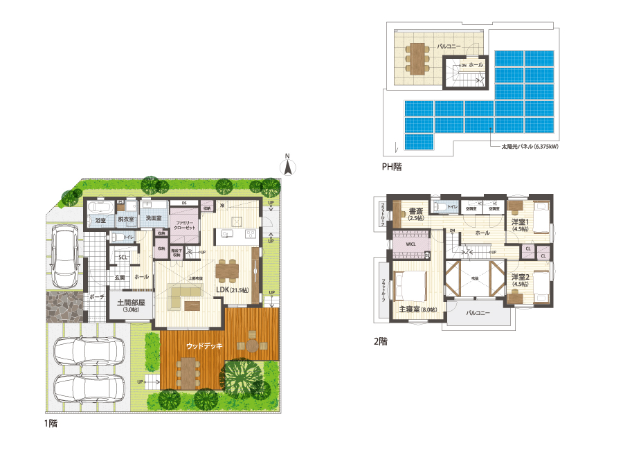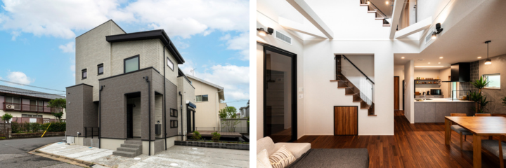 グレーの外壁がモダンな住まい。吹き抜けがある約22帖のLDKとウッドデッキが繋がることで、心地よい広がりを感じる空間が特徴的です。また、土間玄関や各階の大容量収納スペース・屋上庭園など家族のライフスタイルに合わせて自由にお使いいただけるスペースが家の隅々に散りばめられています。太陽光パネルを約6.4kw搭載しており、家計に優しい暮らしが実現できます。また、YUCACOシステムを搭載し、1年中快適な暮らしをご体感いただけます。
