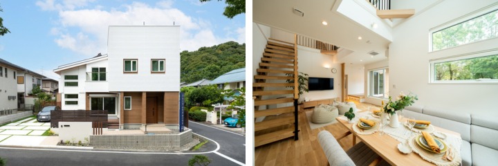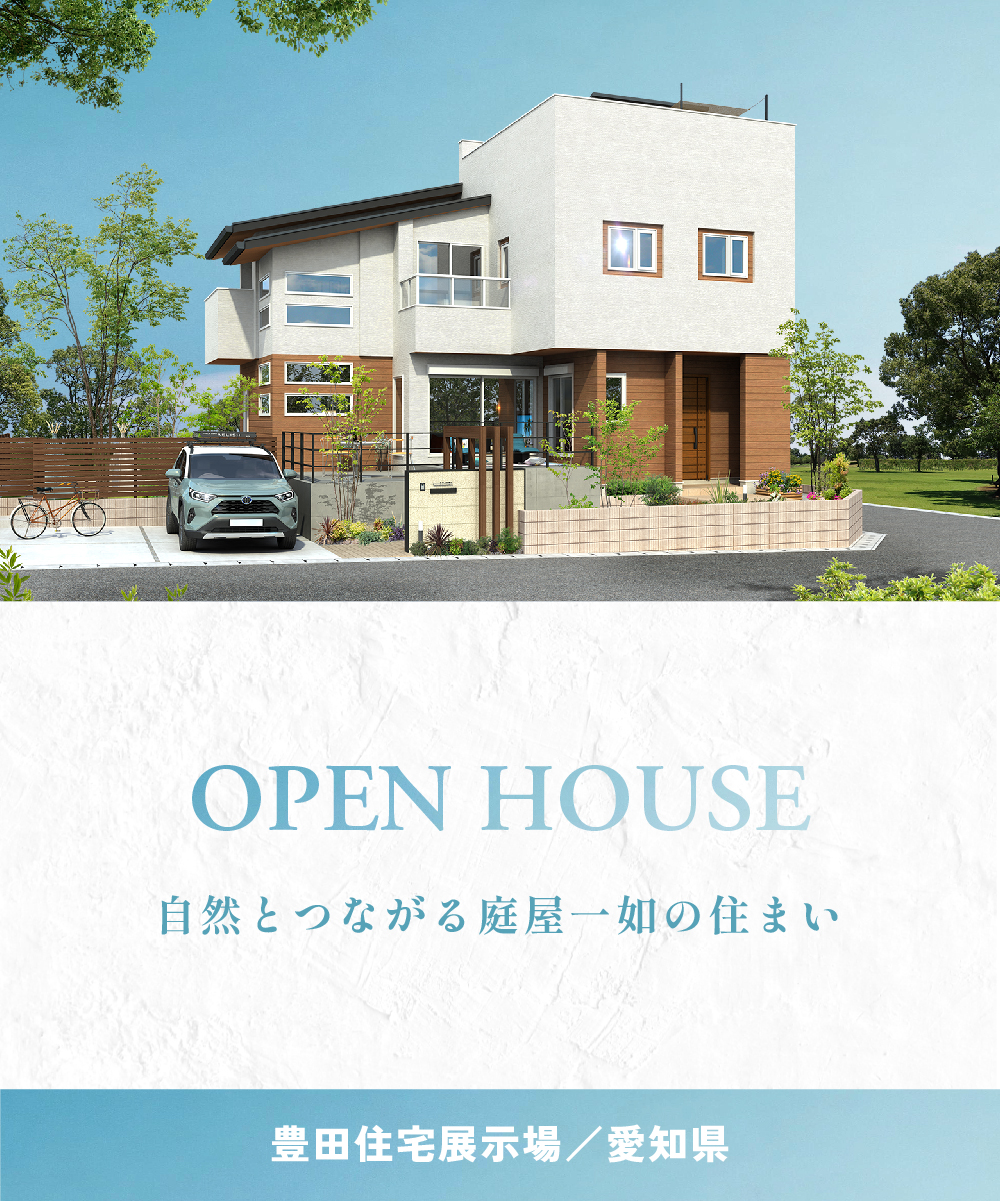 公園の前に佇む住まいは、自然を感じる空間が満載。ウッドデッキ・バルコニー・スカイガーデンと景色を楽しめる外部空間に加えて、玄関ホールや脱衣室かも坪庭を望めるなど緑を感じるモデルハウスです。大空間のLDK、家事が楽になる動線、散らからない収納計画などおうち時間の豊かさ、快適さ、楽しさを感じる間取り。大容量の太陽光パネルとAirフローシステムも搭載しています。
