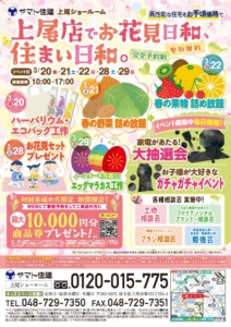 イベント 2026年3月20日(金)21日(土)22日(日)28日(土)29日(日)10:00~17:00 new お花見日和、住まい日和。(上尾ショールーム) 【住まいのギャラリー上尾店】 完全予約制!参加無料!上尾ショールームでお花見日和、住まい日和。! 家族みんなで楽しめる内容が盛りだくさんです…… 開催:上尾ショールーム 詳しくはこちら