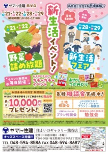 イベント 2026年3月21日(土)22日(日)28日(土)29日(日)10:00~17:00 new 「新生活イベント」開催!(熊谷店) 【住まいのギャラリー熊谷店】 完全予約制!参加無料!「新生活イベント」開催! 家族みんなで楽しめる内容が盛りだくさんです…… 開催:住まいのギャラリー熊谷店 詳しくはこちら