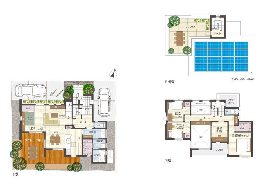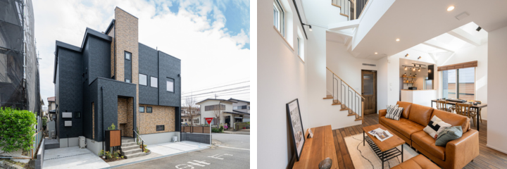 2つの吹き抜けで開放的なLDK、デッキや屋上庭園などの外部空間も備え、家の内外で解放感を感じる住まい。生活に合わせて空間の活用方法を変化させることができるリビングや和室、子ども部屋を採用し、いつまでも暮らしやすい間取りを採用しました。全館空調エアフローシステムや空気清浄システムのトルネックスを搭載し、家全体が快適。また、6.0kWの太陽光発電システムも採用しています。