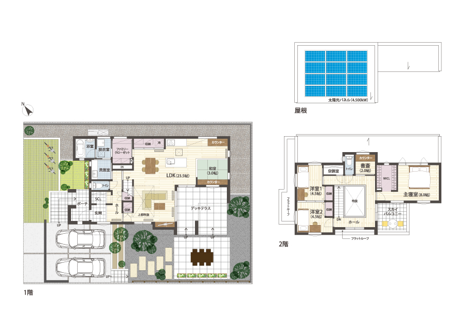広い敷地を活かしたモデルハウスは、家の内外が自然とつながる間取りが目を惹く住まい。デッキテラスやスカイバルコニーなどアウトドア空間が満載です。2階には、子ども部屋や書斎、主寝室、バルコニーも設けました。太陽光発電システムを7.5kW搭載し、家計と地球にやさしい住宅を実現しました。YUCACOシステムで年中快適にお過ごしいただけます。