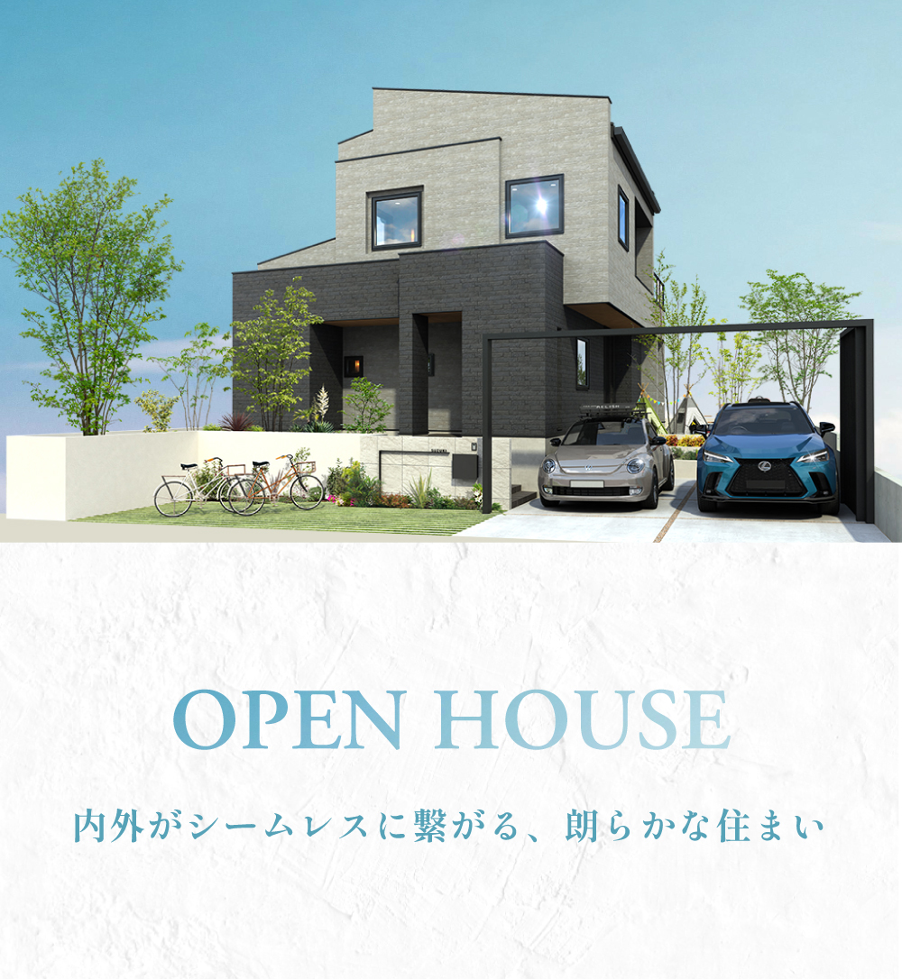 広い敷地を活かしたモデルハウスは、家の内外が自然とつながる間取りが目を惹く住まい。デッキテラスやスカイバルコニーなどアウトドア空間が満載です。2階には、子ども部屋や書斎、主寝室、バルコニーも設けました。太陽光発電システムを7.5kW搭載し、家計と地球にやさしい住宅を実現しました。YUCACOシステムで年中快適にお過ごしいただけます。