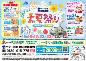 イベント 2023年7月15日(土)16日(日)17日(祝)22日(土)23日(日) 10:00~17:00 <完全予約制>「大夏祭り」開催!(上尾ショールーム) 【上尾ショールーム】 「大夏祭り」を開催! WEBにて事前予約をしてご来店の方に、ギフト券20,000円…… 開催:上尾ショールーム 詳しくはこちら