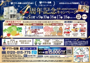 イベント 2023年9月9日(土)10日(日)16日(土)~18日(月) 10:00~17:00 <参加無料>「4周年記念キャンペーン」実施!(上尾ショールーム) 【上尾ショールーム】 「4周年記念キャンペーン」を実施! WEBにて事前予約をしてご来店の方に、ギフト券15,000円…… 開催:上尾ショールーム 詳しくはこちら