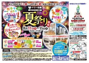 イベント 2022年8月11日(祝)~15日(月)10:00~17:00 「夏祭り」開催!(上尾ショールーム) 【上尾ショールーム】 「詰め放題祭」を開催いたします! WEBにて事前予約をしてご来店の方に、QUOカード10,000円分…… 開催:上尾ショールーム 詳しくはこちら