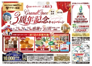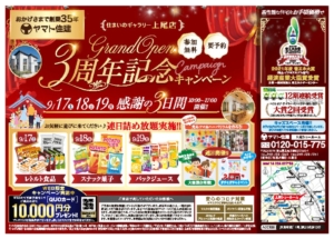 イベント 2022年9月17日(土)18日(日)19日(祝)10:00~17:00 <参加無料>「3周年記念キャンペーン」開催!(上尾ショールーム) 【上尾ショールーム】 「3周年記念キャンペーン」を開催いたします! WEBにて事前予約をしてご来店の方に、QUOカード10,000円分…… 開催:上尾ショールーム 詳しくはこちら