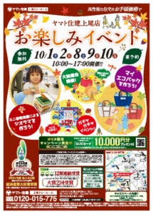 イベント 2022年10月1日(土)2日(日)8日(土)9日(日)10日(祝)10:00~17:00 <参加無料>「お楽しみイベント」開催!(上尾ショールーム) 【上尾ショールーム】 「お楽しみイベント」を開催いたします! ジオラマ作りやエコバッグ作り、大抽選会など盛りだくさん…… 開催:上尾ショールーム 詳しくはこちら
