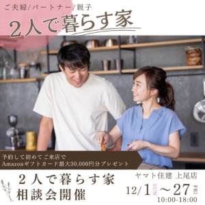 イベント 2024年12月1日(日)~27日(金)まで 「2人で暮らす家相談会」開催!(上尾ショールーム) 【上尾ショールーム】 「2人で暮らす家相談会」開催! それぞれのお悩みや条件に合わせて相談できます…… 開催:上尾ショールーム 詳しくはこちら