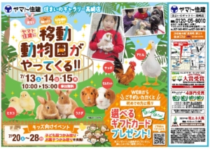 イベント 7月13日(土)14日(日)15日(月) 【参加無料】移動動物園がやってくる!(高崎店) 【住まいのギャラリー高崎店】 移動動物園がやってくる! WEBから予約して初めてご来場の方に選べるギフト…… 開催:住まいのギャラリー高崎店 詳しくはこちら