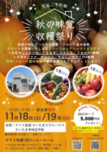 イベント 2023年11月18日(土)19日(日) 「秋の収穫祭り」開催!(川口ショールーム) 【ヤマトギャラリー川口ショールーム】 「秋の味覚収穫祭り」開催! それぞれのお悩みや条件に合わせて相談できます…… 開催:ヤマトギャラリー川口ショールーム 詳しくはこちら