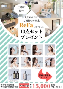 イベント ~2023年9月末まで 三木店限定!9月末までにご契約の方へ「ReFa10点セットプレゼント」実施!(三木店) 【住まいのギャラリー三木店】 三木店限定!「ReFa10点セットプレゼント」実施! 初めてのご来店で最大15,000円分のギフト券も…… 開催:住まいのギャラリー三木店 詳しくはこちら