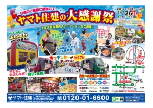 イベント 2023年11月26日(日)11:00~16:00 <参加無料>「ヤマト住建の大感謝祭」開催!(三木店) 【住まいのギャラリー三木店】 「ヤマト住建の大感謝祭」開催! キッチンカーやイベント・物販ブースなど…… 開催:住まいのギャラリー三木店 詳しくはこちら