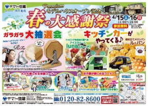 イベント 2023年4月15日(土)16日(日)11:00~16:00 「春の大感謝祭」開催!(西宮北店) 【住まいのギャラリー西宮北店】では、 参加無料の「春の大感謝祭」を開催いたします! 大人からお子さままで楽しめるイベント…… 開催:住まいのギャラリー西宮北店/西宮北住宅展示場 詳しくはこちら