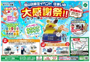 イベント 2019年9月7日(土)8日(日)11:00~17:00 「住まいの大感謝祭」開催!(岡山店) 【住まいのギャラリー岡山店】 参加無料!岡山店にて「住まいの大感謝祭」を開催いたします ◇キッズのお楽しみ「ふわふわケンケン」がやって来る…… 開催:住まいのギャラリー岡山店 詳しくはこちら
