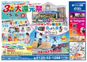 イベント 2023年8月5日(土)6日(日)10:00~17:00 「3周年大感謝祭」開催!(南大阪店) 【住まいのギャラリー南大阪店】 「3周年大還元祭」開催! WEBからの事前予約などで、ギフト券最大27,000円分プレゼント…… 開催:住まいのギャラリー南大阪店 詳しくはこちら
