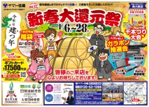 イベント 2024年1月6日(土)~28日(日)10:00~19:00 「新春大還元祭」開催!(南大阪店) 【住まいのギャラリー南大阪店】 新年最初のおでかけはヤマト住建へ!ご家族そろってお越しください! <今年は建つ年>「新春大還元祭」開催…… 開催:住まいのギャラリー南大阪店 詳しくはこちら