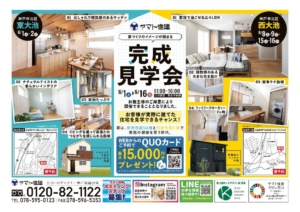 見学会 2024年6月1日(土)~16日(日) 家づくりのイメージが固まる「完成見学会」開催!(神戸鈴蘭台店) 【住まいのギャラリー神戸鈴蘭台店】 家づくりのイメージが固まる完成見学会開催! WEBにて事前予約の方にギフト券15,000円分…… 開催:住まいのギャラリー神戸鈴蘭台店 詳しくはこちら