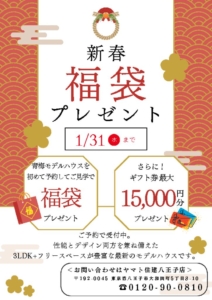 イベント 2024年1月31日(水)まで 青梅モデルハウス見学予約で「新春福袋プレゼント!」(八王子店) 【住まいのギャラリー八王子店】 青梅モデルハウス見学予約で新春福袋プレゼント! さらに最大15,000円分のギフト券も…… 開催:住まいのギャラリー八王子店 詳しくはこちら