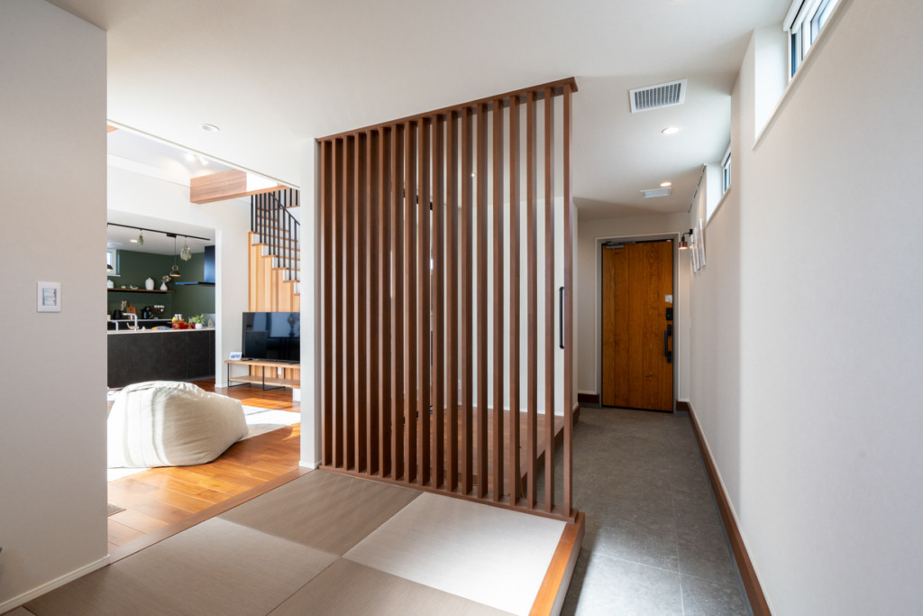 玄関扉を開けると広いエントランスギャラリー。外遊びの道具やベビーカーなど自分の生活スタイルに合わせてモノを配置できます。