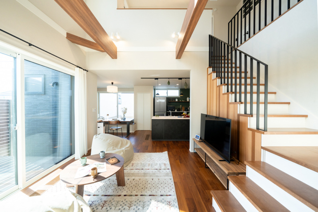 リラックスダイニングが特徴的なLDKは、ウッドデッキと繋がる一室空間。和室やロジアも設け、1階で過ごしたくなる居心地の良いフロアです。