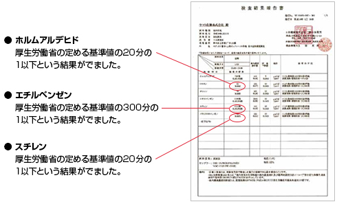 ヤマト住建の住宅は、天然無垢材をふんだんに使用しています。天然無垢材は空気浄化作用のあるフィトンチッド類が多く含まれており、調湿効果にも優れているので、室内の空気環境を快適に保ちます。さらに24 時間換気システムを導入し、常に綺麗な空気環境を維持しています。室内空気環境の測定では、ホルムアルデヒドなどの有害物質が、厚生労働省の定める基準値の1/20 以下という空気環境を実現しました。