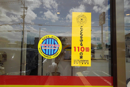 加古川店は、地域の子ども達が安心して暮らせる環境を確保するため“こども110番の家”に協力しています。この取り組みを通して、子ども達の安全を確保するとともに、安心して暮らせる地域社会づくりに貢献したいと考えています。