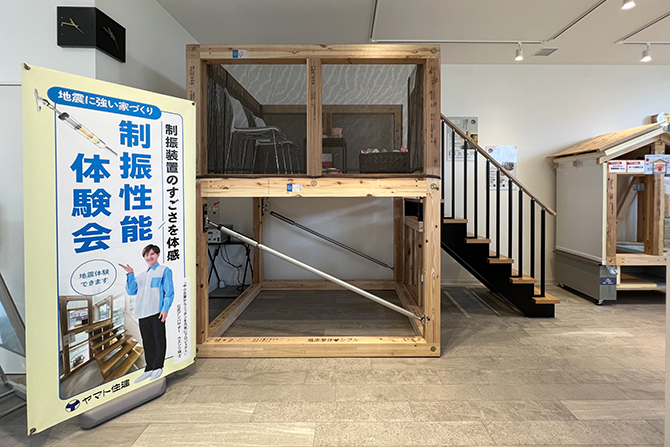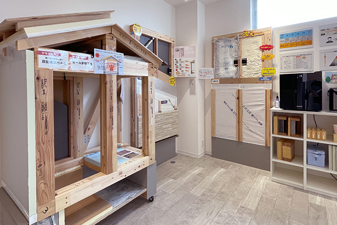 音漏れや結露、外気温をシャットアウトする高性能住宅を体感できる「体感コーナー」。断熱性の高い樹脂サッシ・地震から家族を守る制振装置 などヤマト住建の家づくりの秘密が展示されています。外張り断熱の違いなど、はじめは見るだけ聞くくだけで大歓迎!お客様の注文住宅へのご要望をお聞かせください。