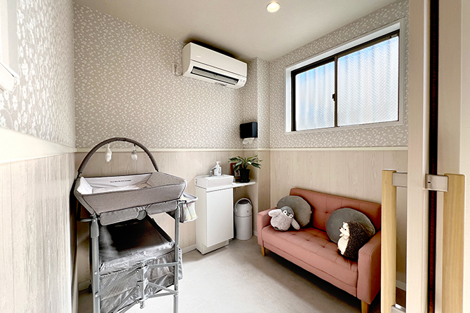 お打ち合わせ中も赤ちゃんと一緒のママが、快適にお過ごし頂けるようにおむつ交換のためのスペースも完備。ミルク用のお湯や、おむつもサイズ別にご用意していますので、お気軽にスタッフまでお申しつけください。