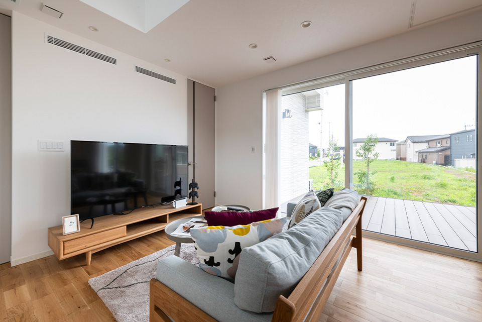 閑静なエリアに建つモデルハウスは、高い断熱性能を誇る住み心地に優れた住まい。解放感と快適性を兼ね備え、最高水準の断熱性能を誇ります。リビングと連続したウッドデッキや、バルコニーなどのアウトドア空間も充実しており、風と光を感じる健やかな住まいです。