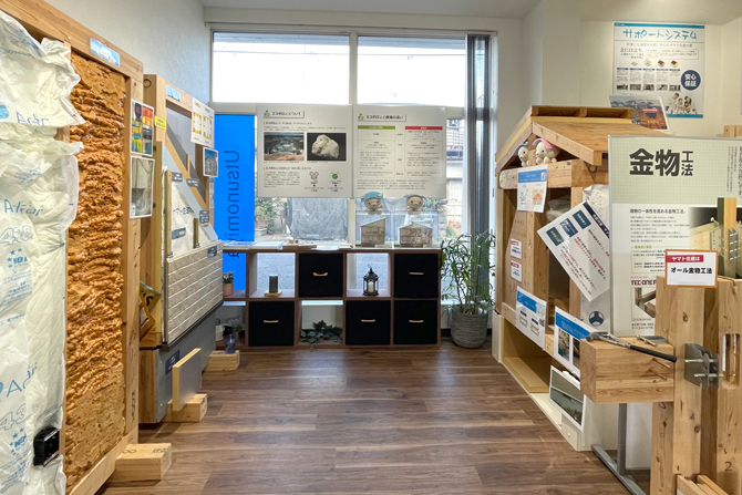 音漏れや結露、外気温をシャットアウトする高性能住宅を体感できる「体感コーナー」。断熱性の高い樹脂サッシ・地震から家族を守る制振装置などヤマト住建の家づくりの秘密が展示されています。