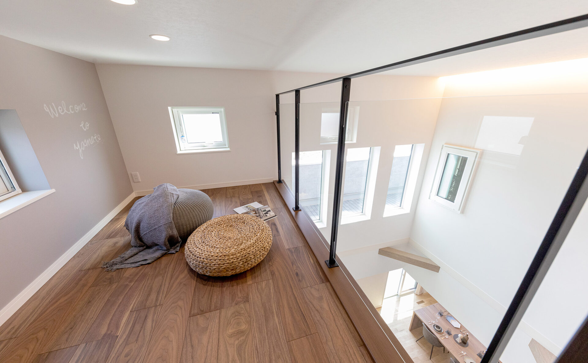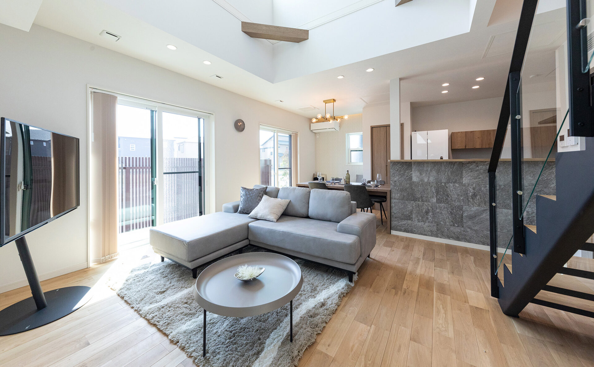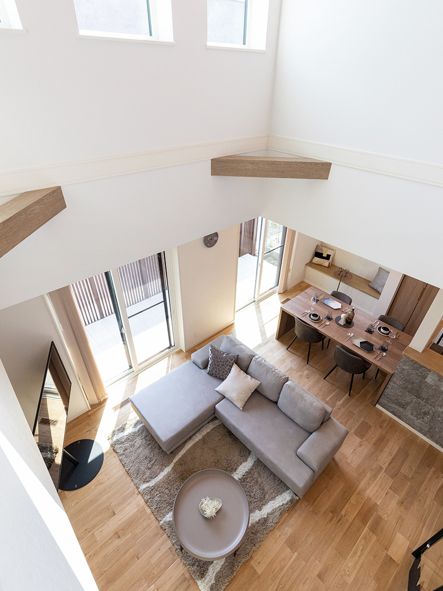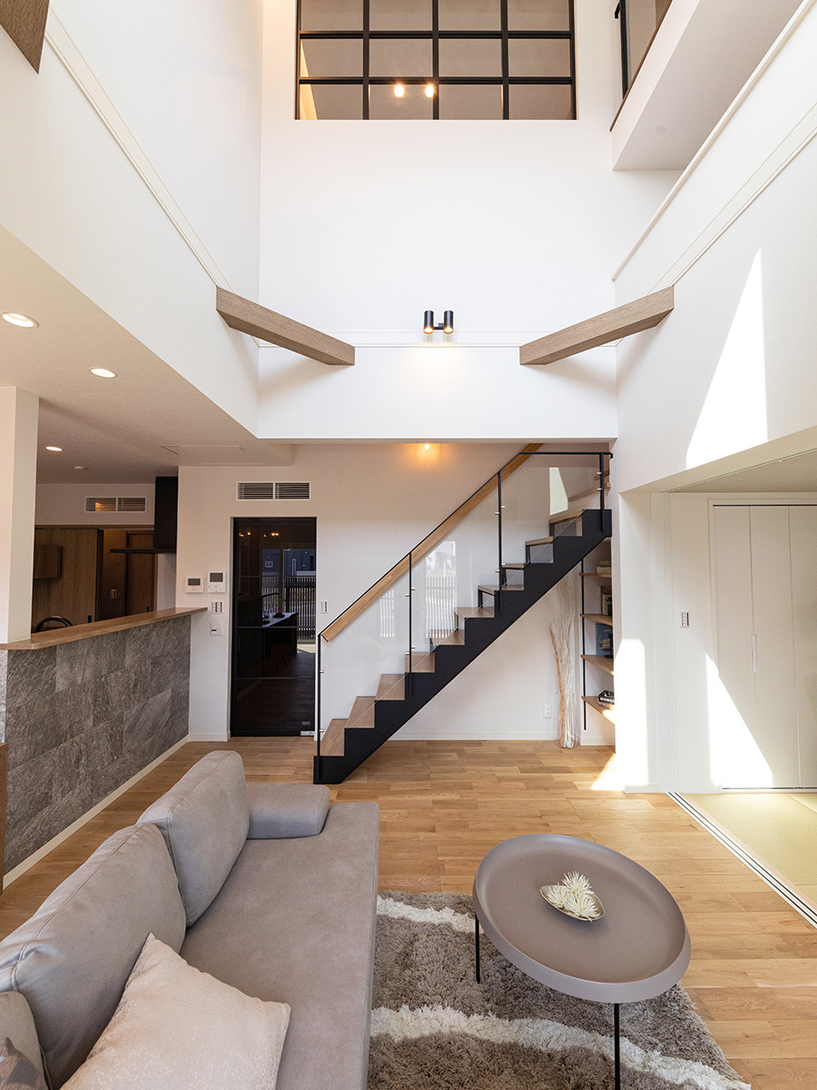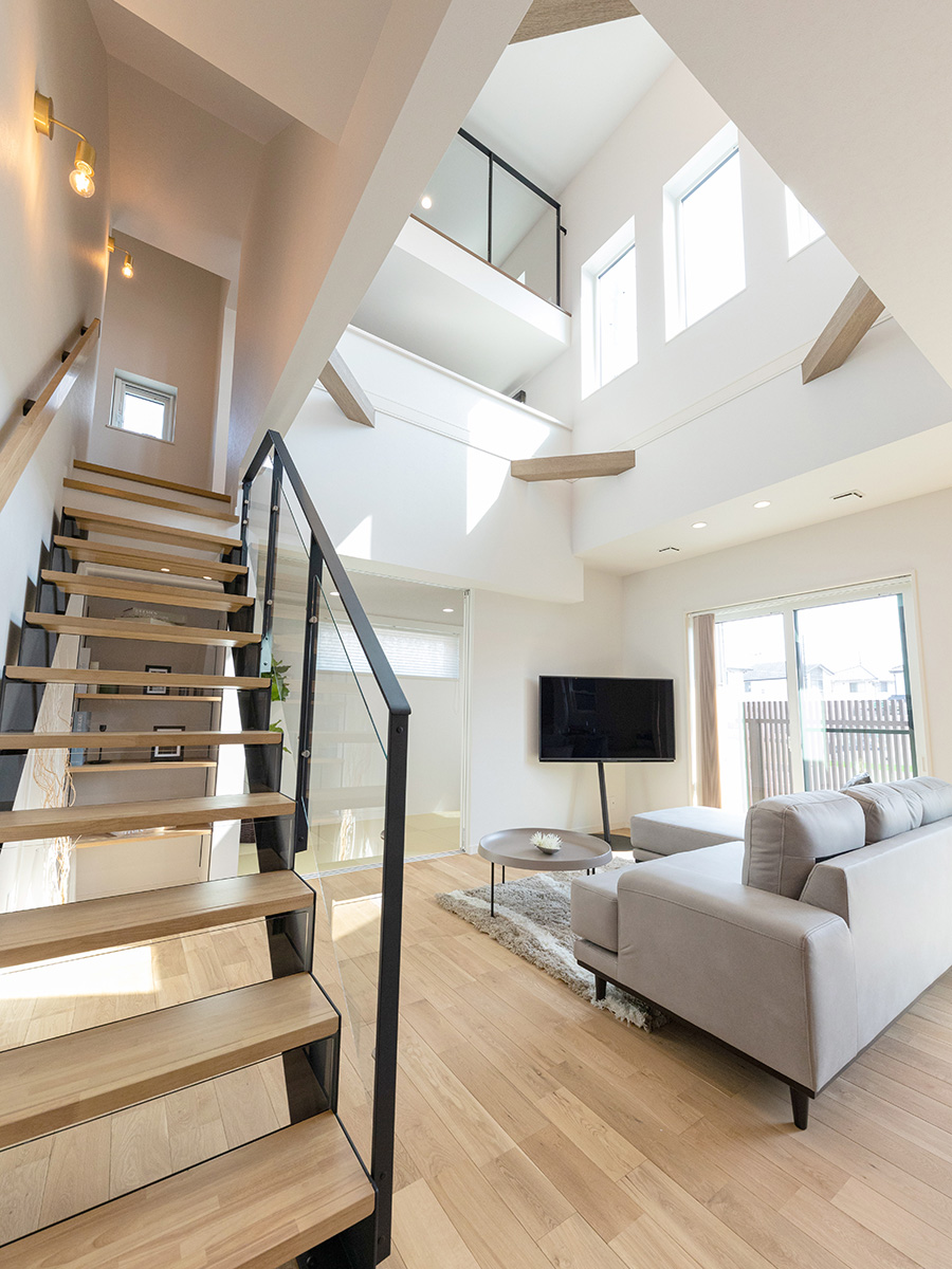 1階リビング~3階のロフトまで繋がる三層吹き抜けで開放感たっぷり。ウッドデッキでアウトドア時間を過ごしたり、落ち着きのある黒のリビング階段が暮らしをおしゃれに演出します。太陽光発電・V2Hで自然にやさしく経済的な暮らしをご提案。室内空気循環システム(エアフローシステム)を採用したモデルハウスです。