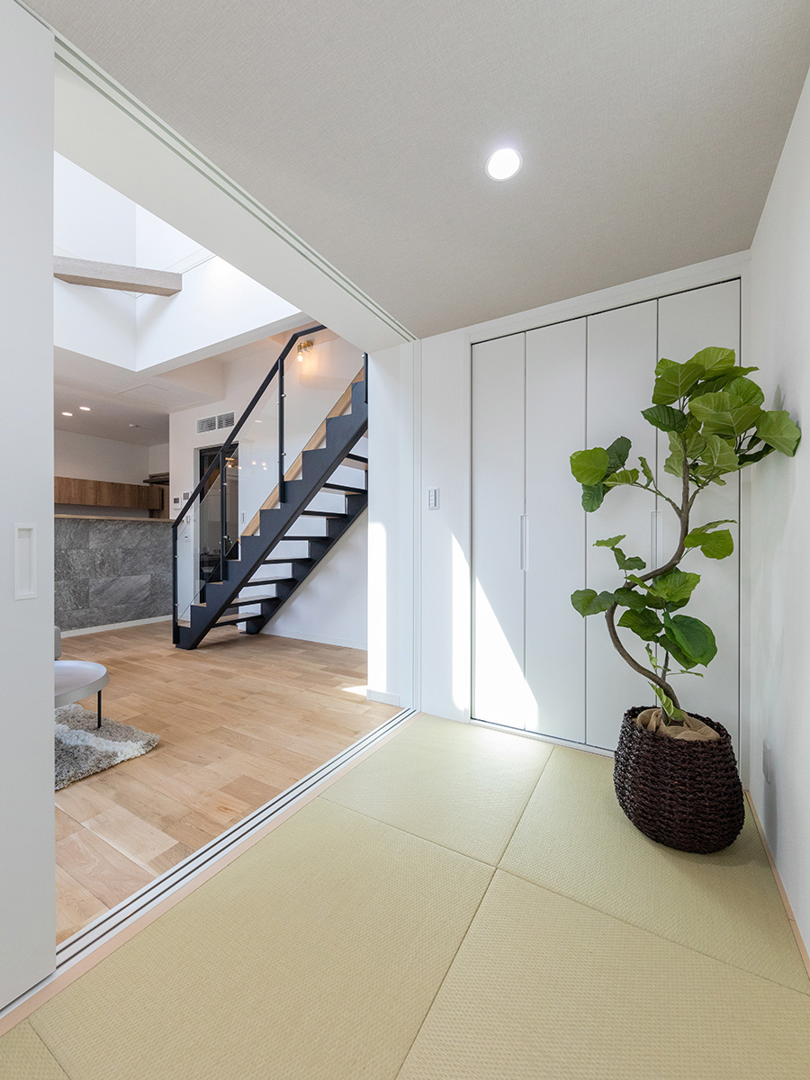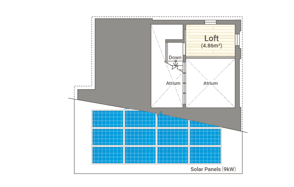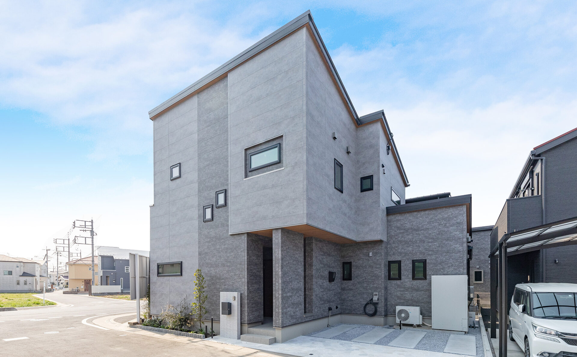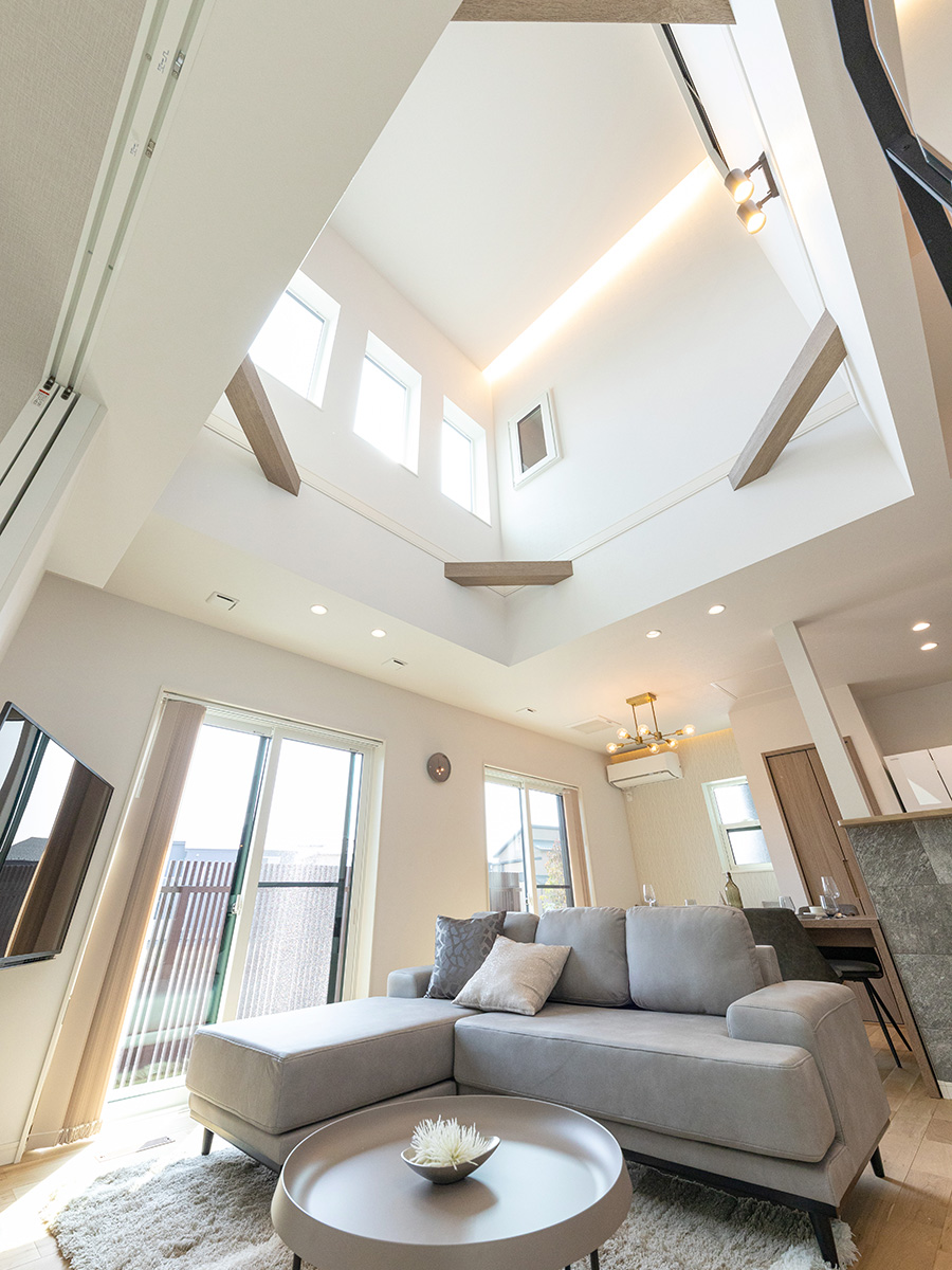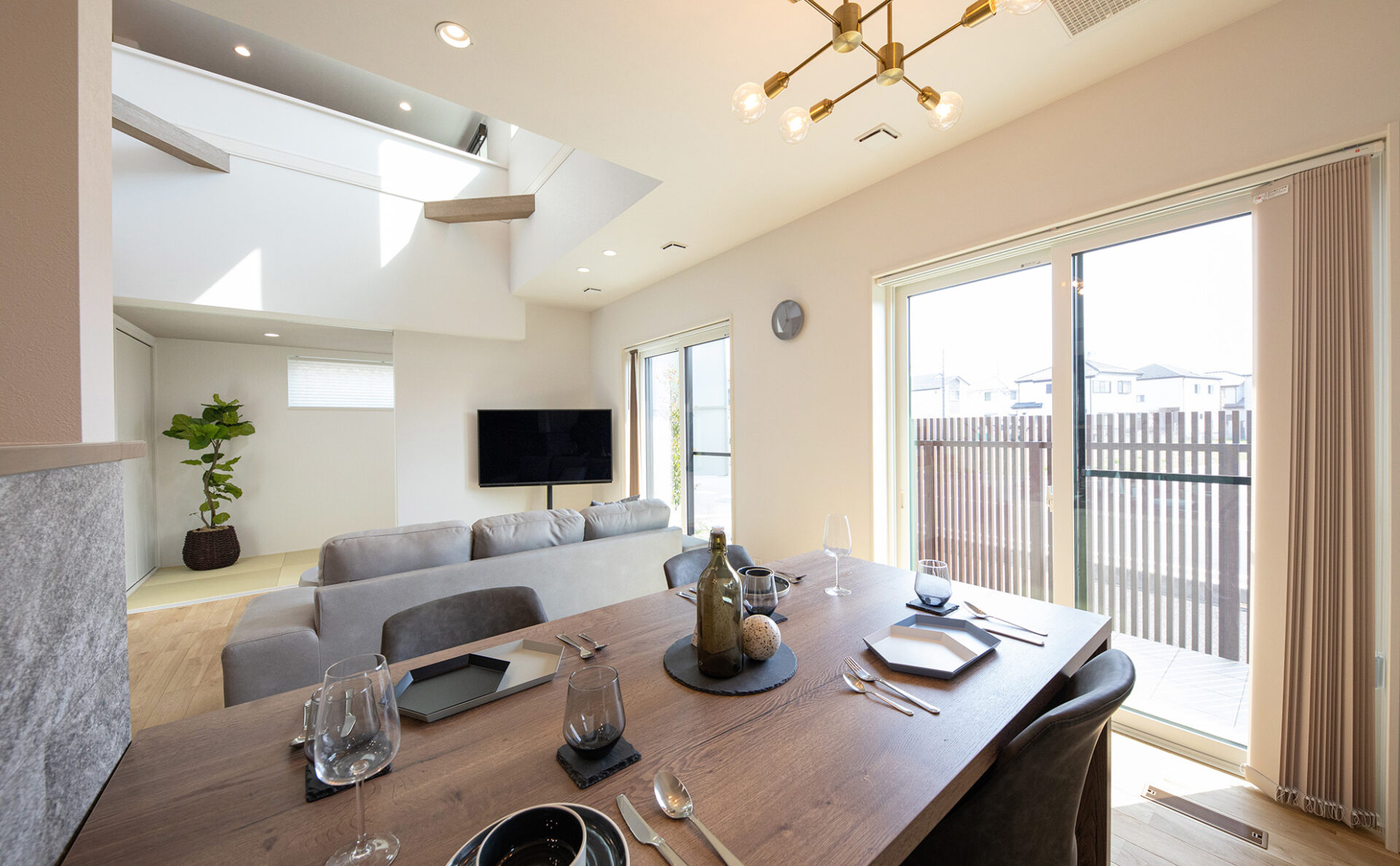 1階リビング~3階のロフトまで繋がる三層吹き抜けで開放感たっぷり。ウッドデッキでアウトドア時間を過ごしたり、落ち着きのある黒のリビング階段が暮らしをおしゃれに演出します。太陽光発電・V2Hで自然にやさしく経済的な暮らしをご提案。室内空気循環システム(エアフローシステム)を採用したモデルハウスです。