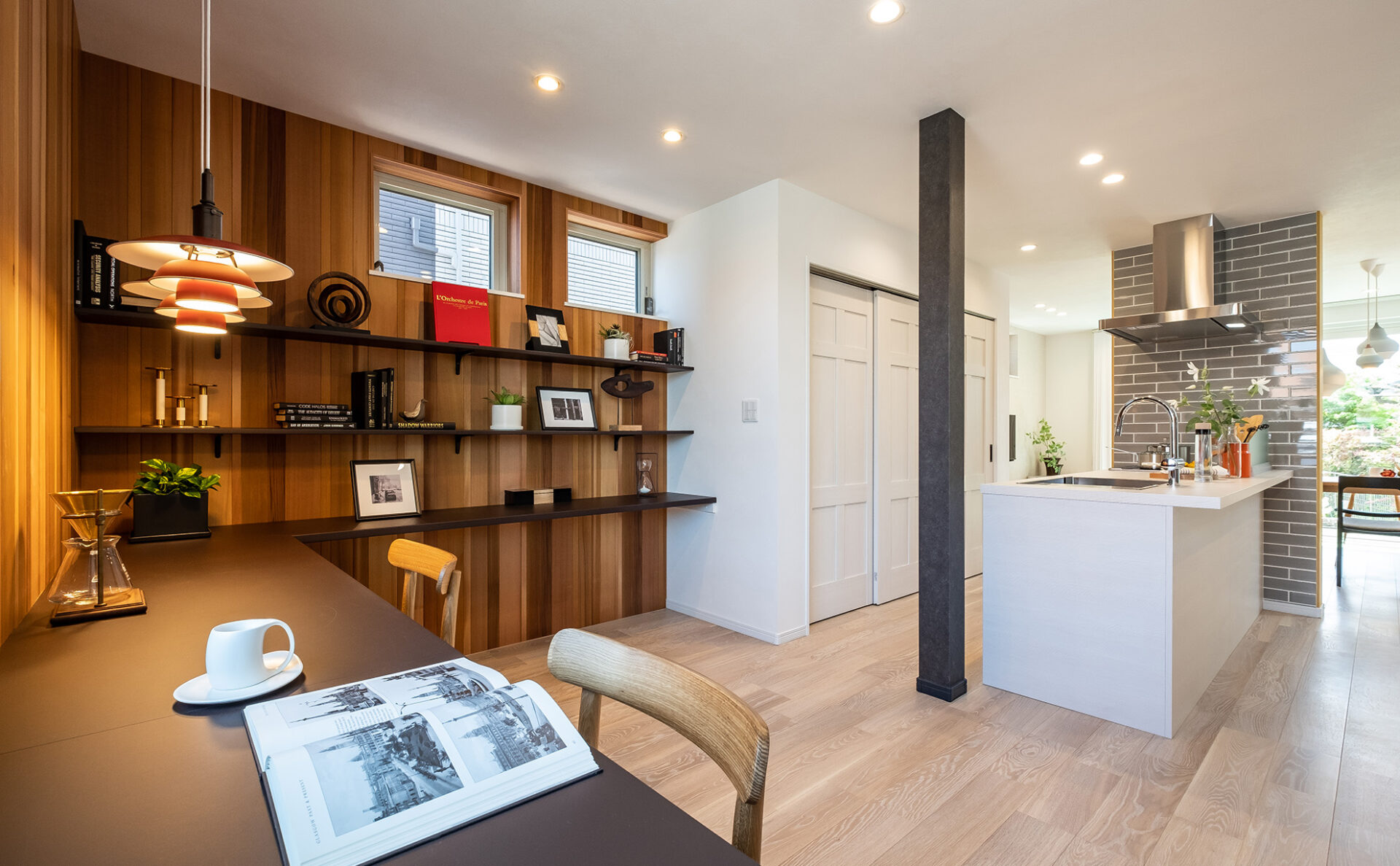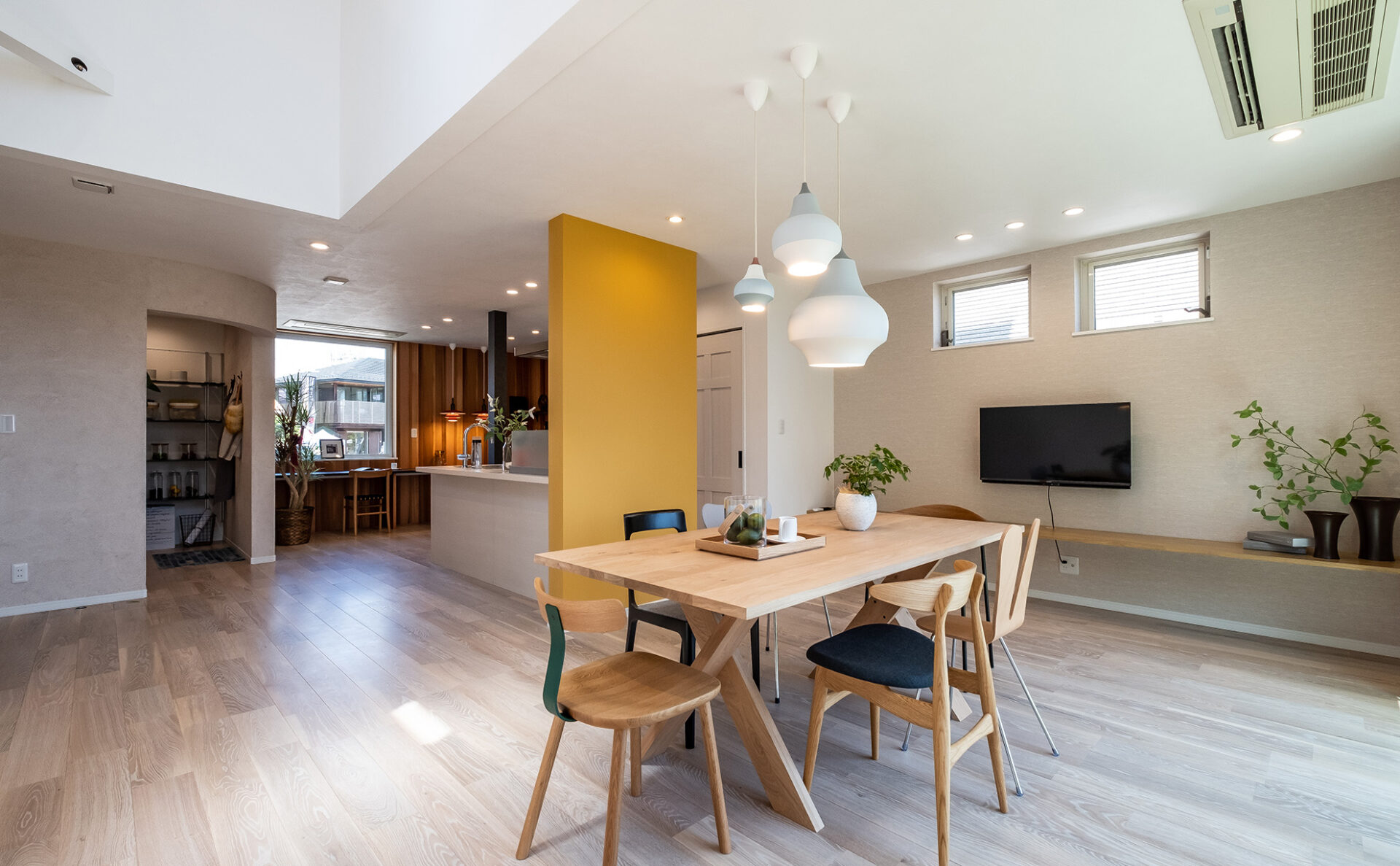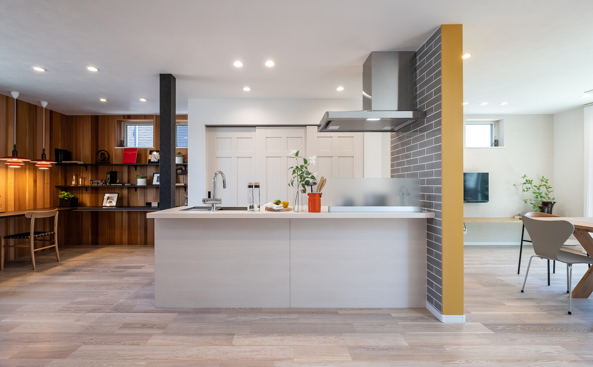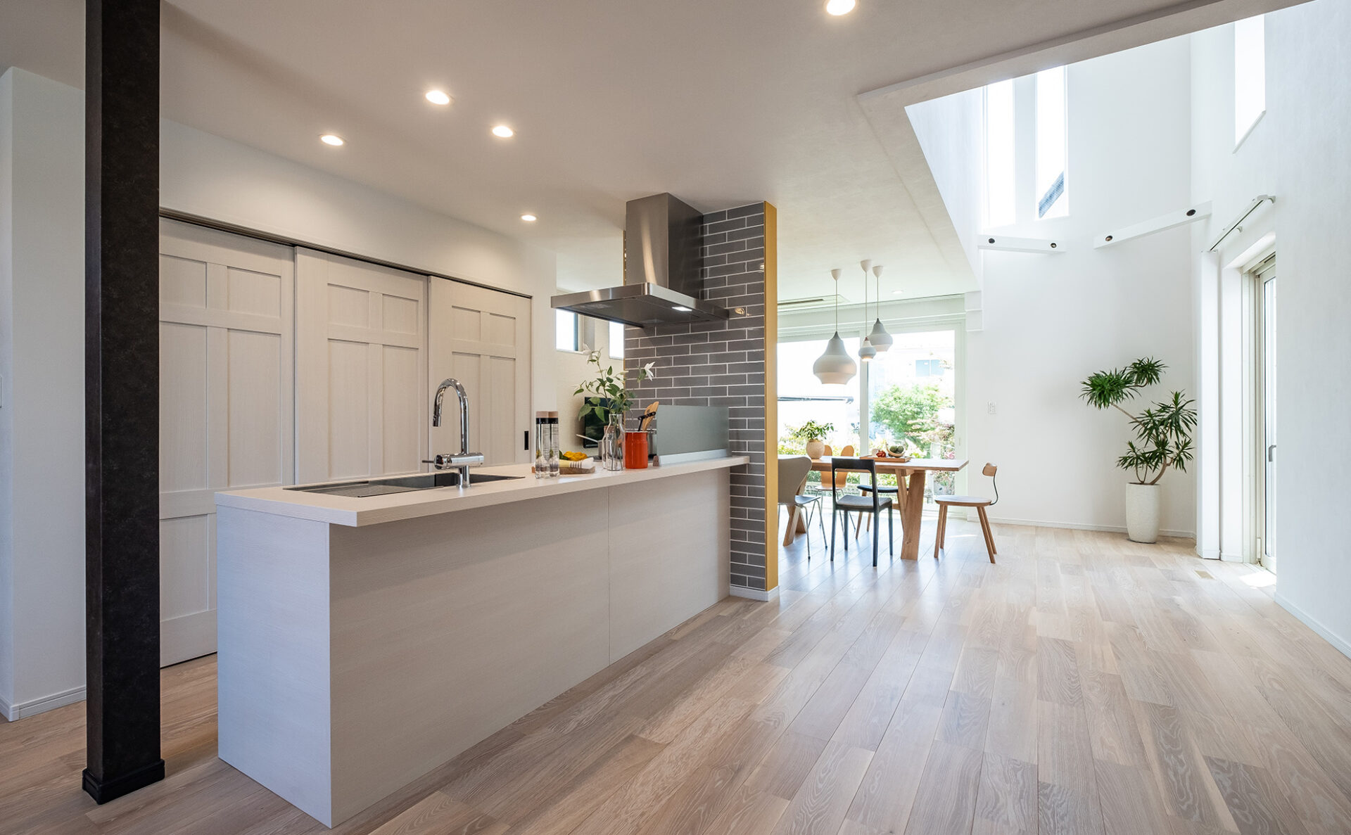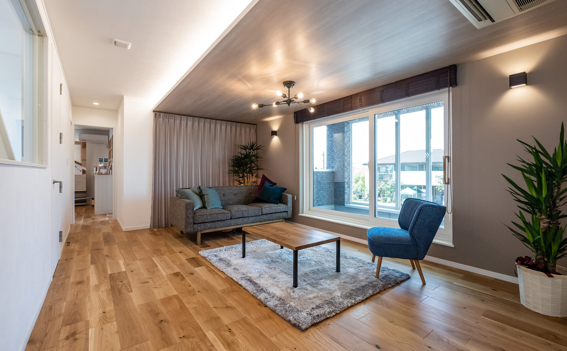 吹き抜けとテラスから光が入る気持ちのいい大空間のリビングダイニング。家事動線にも配慮した使いやすいアイランドキッチン。玄関からつながったファミリークローゼットは家族みんなの上着やかばんなどを収納でき、すっきりと暮らせます。家族で楽しんだり、一人の時間もゆったりと過ごせるご提案が詰まったモデルルームです。