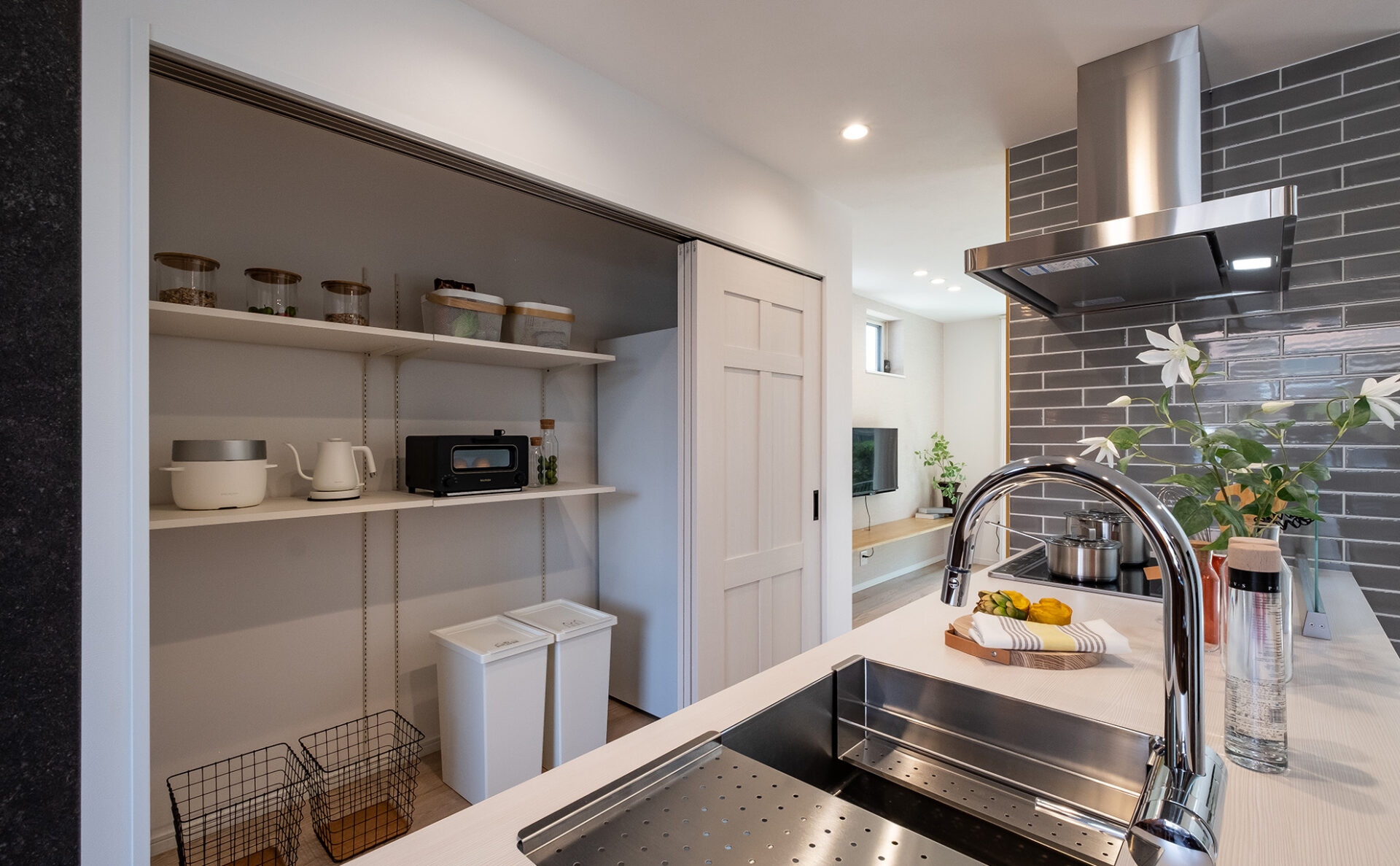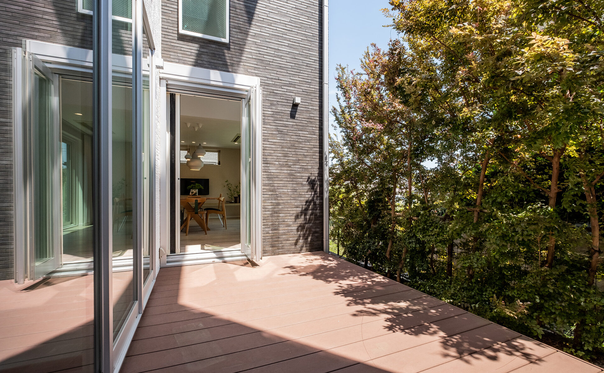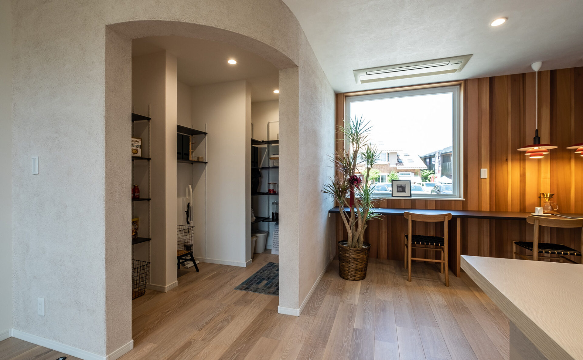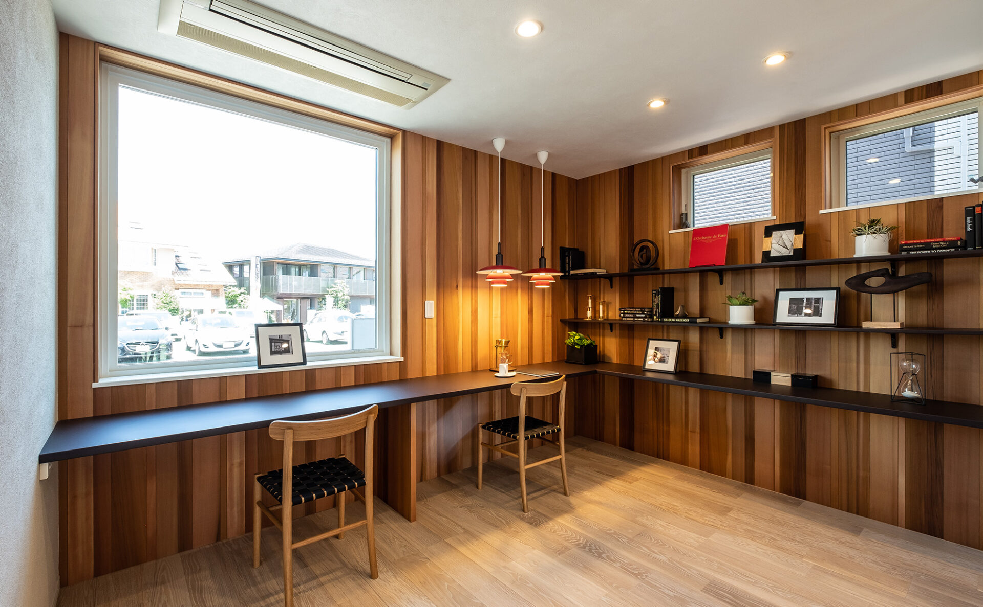 吹き抜けとテラスから光が入る気持ちのいい大空間のリビングダイニング。家事動線にも配慮した使いやすいアイランドキッチン。玄関からつながったファミリークローゼットは家族みんなの上着やかばんなどを収納でき、すっきりと暮らせます。家族で楽しんだり、一人の時間もゆったりと過ごせるご提案が詰まったモデルルームです。