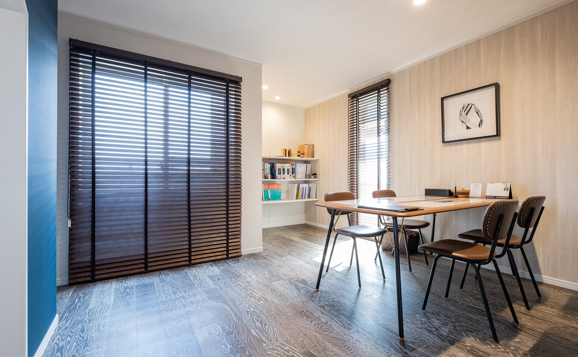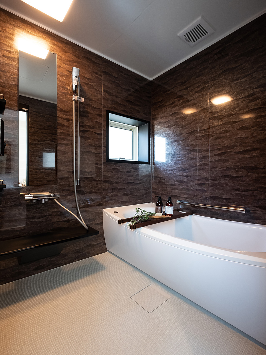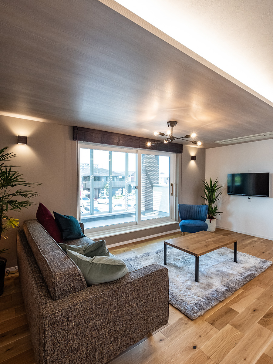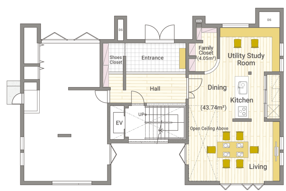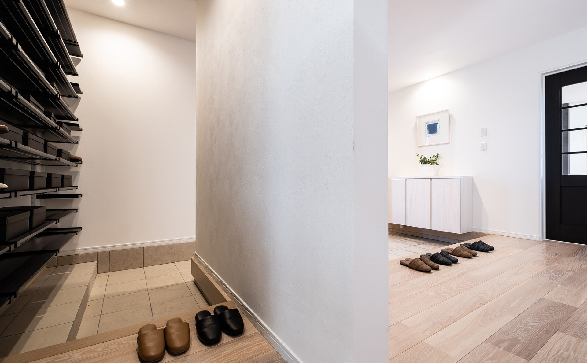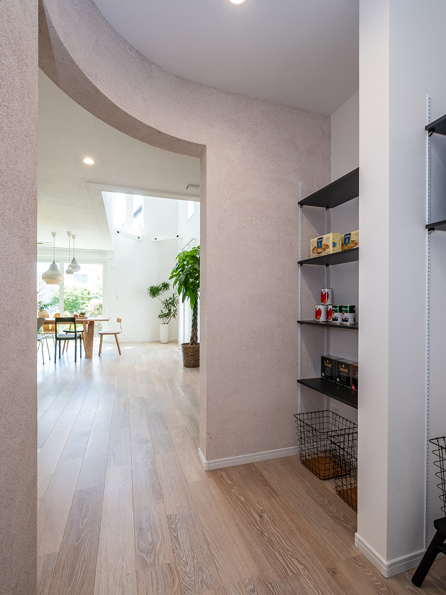 吹き抜けとテラスから光が入る気持ちのいい大空間のリビングダイニング。家事動線にも配慮した使いやすいアイランドキッチン。玄関からつながったファミリークローゼットは家族みんなの上着やかばんなどを収納でき、すっきりと暮らせます。家族で楽しんだり、一人の時間もゆったりと過ごせるご提案が詰まったモデルルームです。