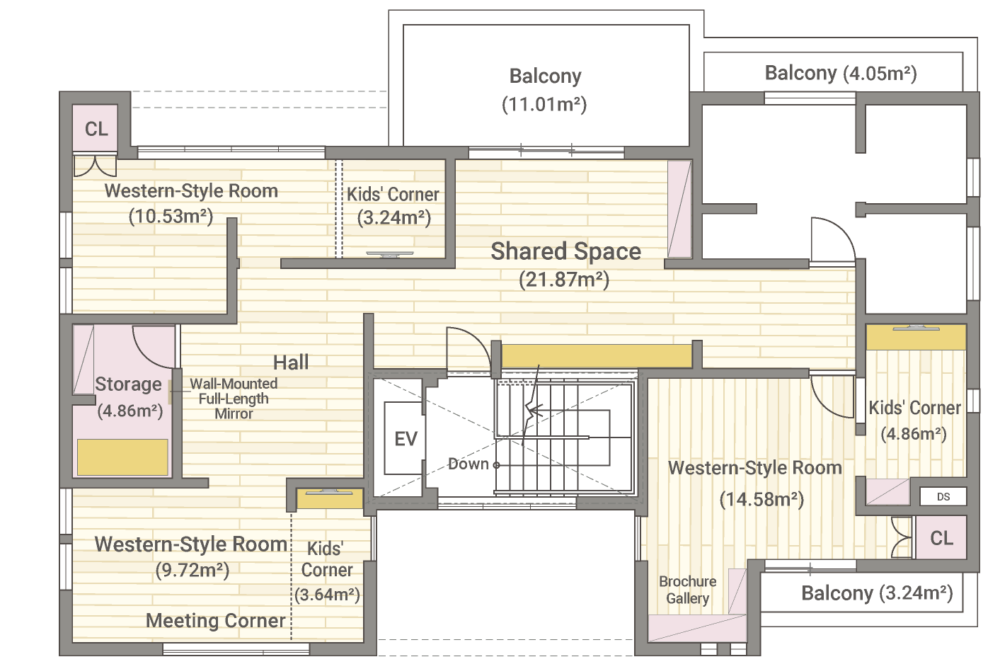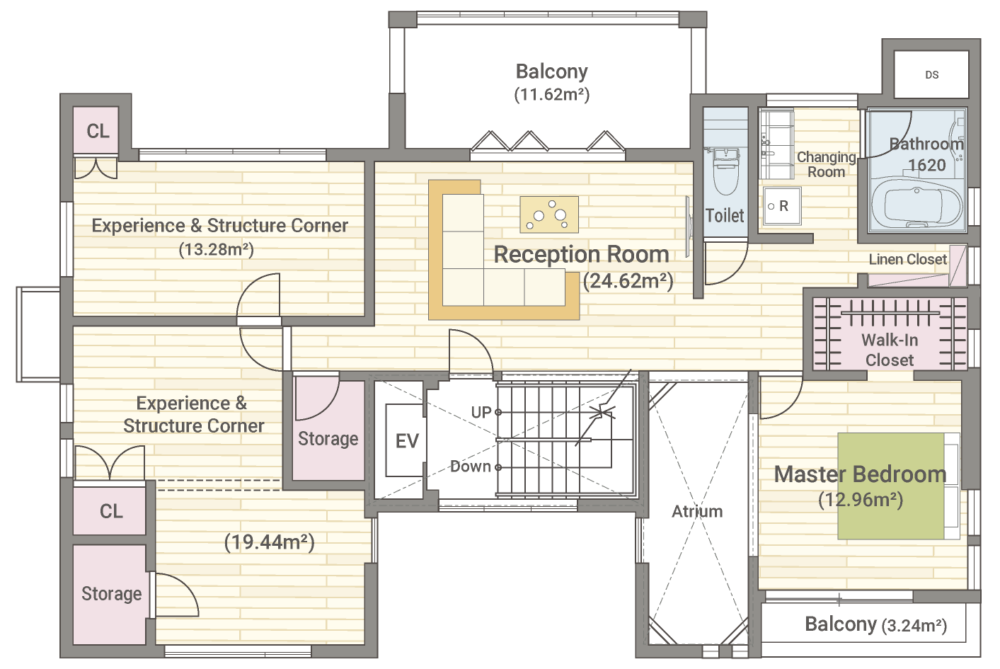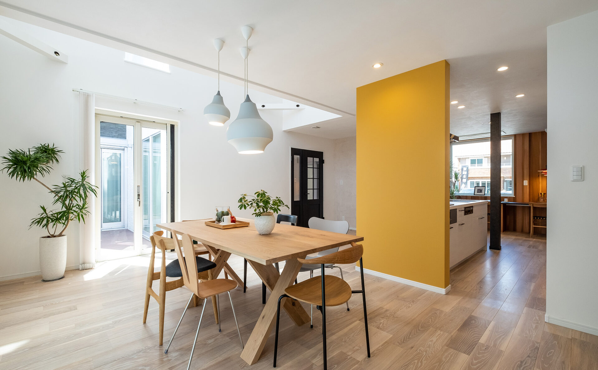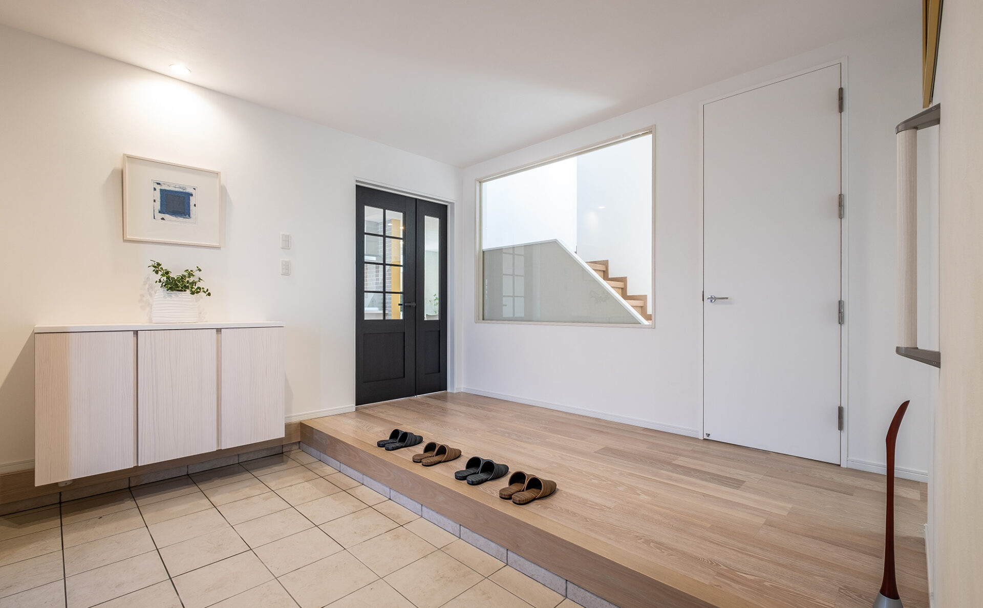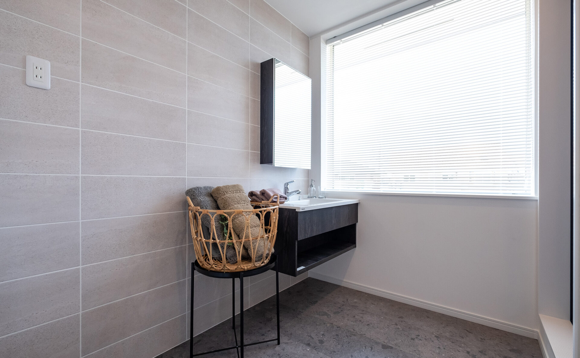 吹き抜けとテラスから光が入る気持ちのいい大空間のリビングダイニング。家事動線にも配慮した使いやすいアイランドキッチン。玄関からつながったファミリークローゼットは家族みんなの上着やかばんなどを収納でき、すっきりと暮らせます。家族で楽しんだり、一人の時間もゆったりと過ごせるご提案が詰まったモデルルームです。
