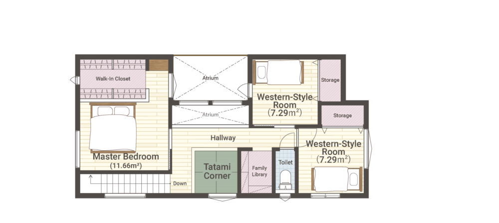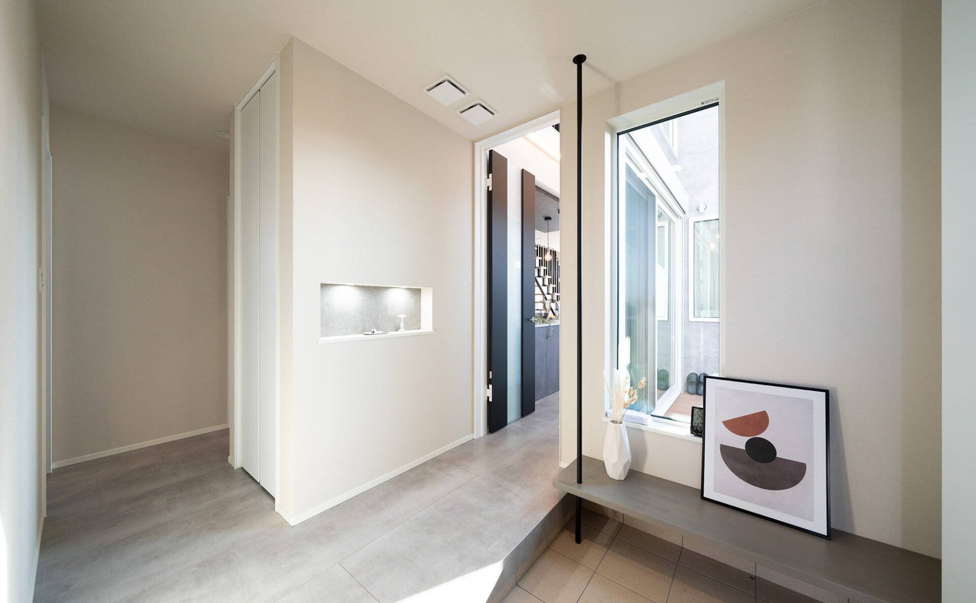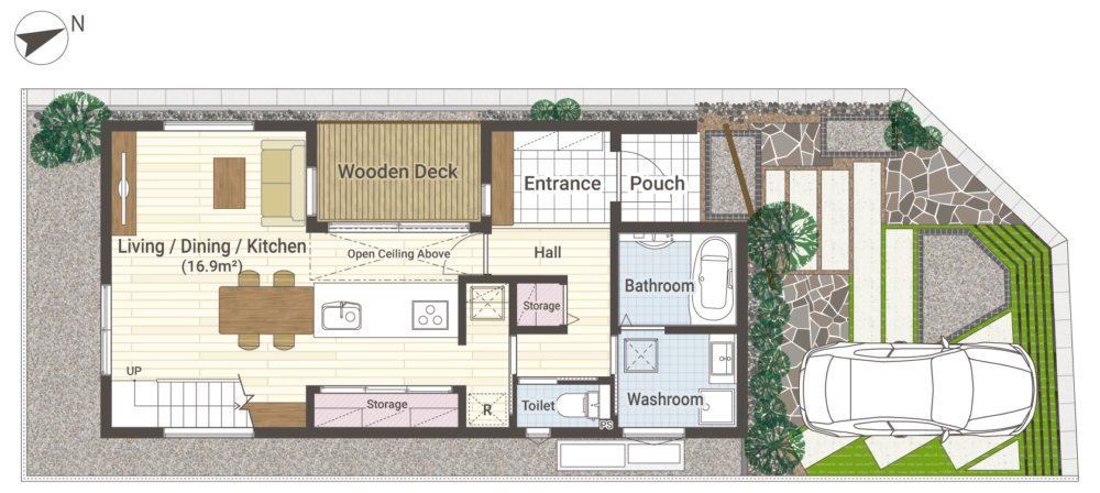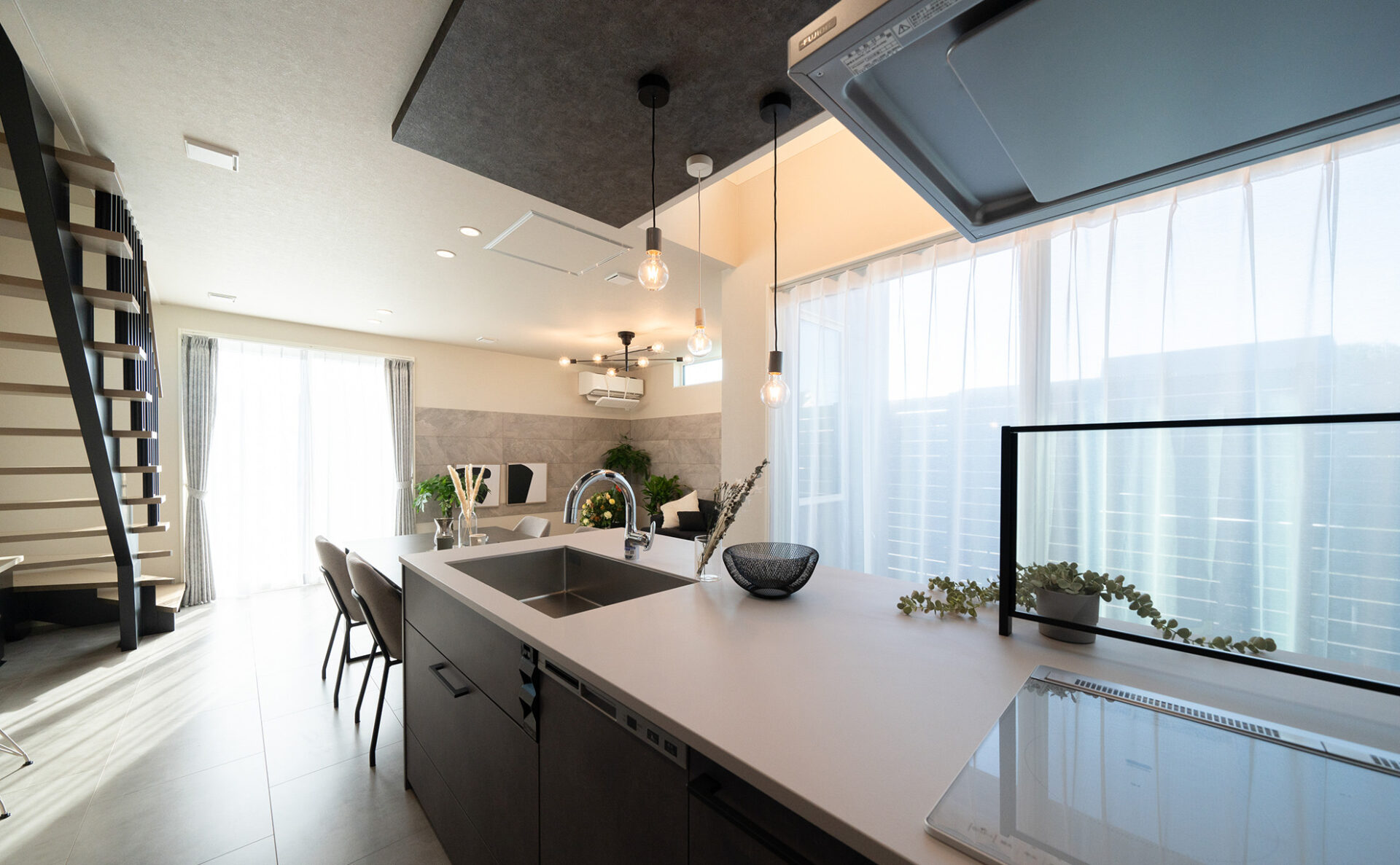 南北に抜ける広々LDKで開放感あふれるくつろぎ空間が魅力の住まい。約31坪ながら空間を効率的につかうことで、暮らしがラクになる収納スペースや柔軟に使えるタタミコーナーなど様々なスペースを取り入れました。内と外がつながるデッキも魅力のひとつ。太陽光パネルを約6.75kw搭載しており、家計に優しい暮らしを実現できます。